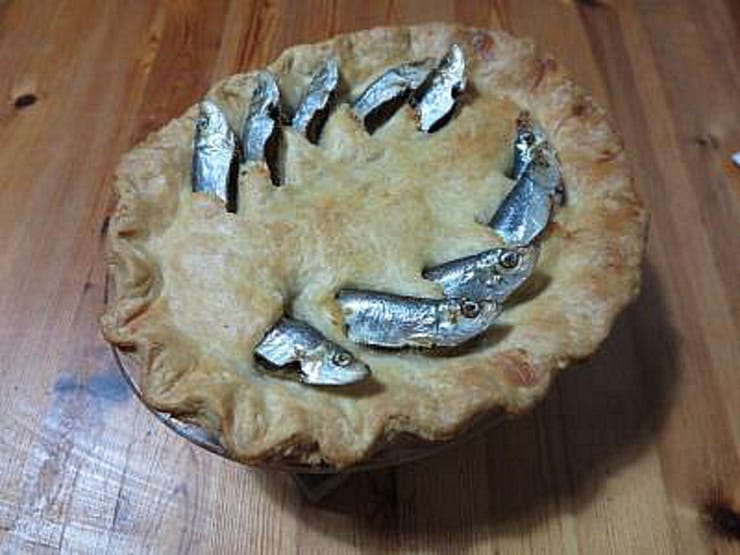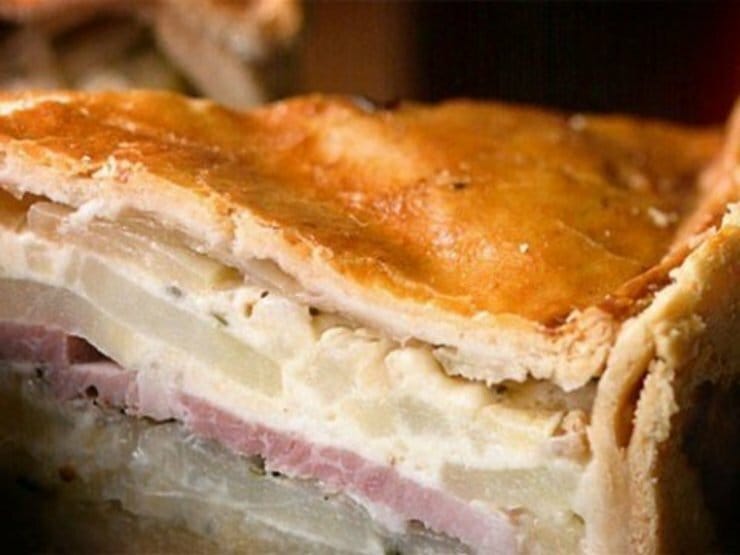 Preheat the oven to 190C/375F/Gas 5. Line a 23cm/9" spring-form cake tin with the pastry, bringing the pastry up over the edge of the tin, reserving enough to make a lid.