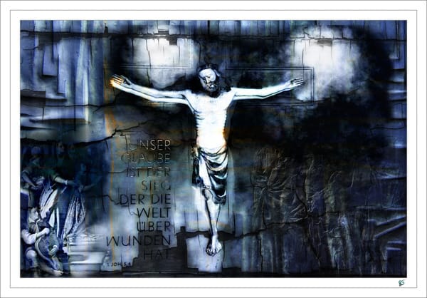 Then, in Berlin, we visited the Kaiser Wilhelm Memorial Church, rebuilt after being flattened by the Allies in 1943. We walked into the interior, and I stared in awe at the towering walls made from blue glass bricks, and an ethereal Jesus suspended in space. Then to one side, in an alcove, I saw a small image of Jesus with a line from the Gospel of John. I gathered it up into my camera. Then, as we continued travelling, I collected the front door of the Cathedral in East Berlin, an Etruscan carving in the Vatican Museum and a small stained glass window in the mysterious Cathedral in Lucca, Tuscany.