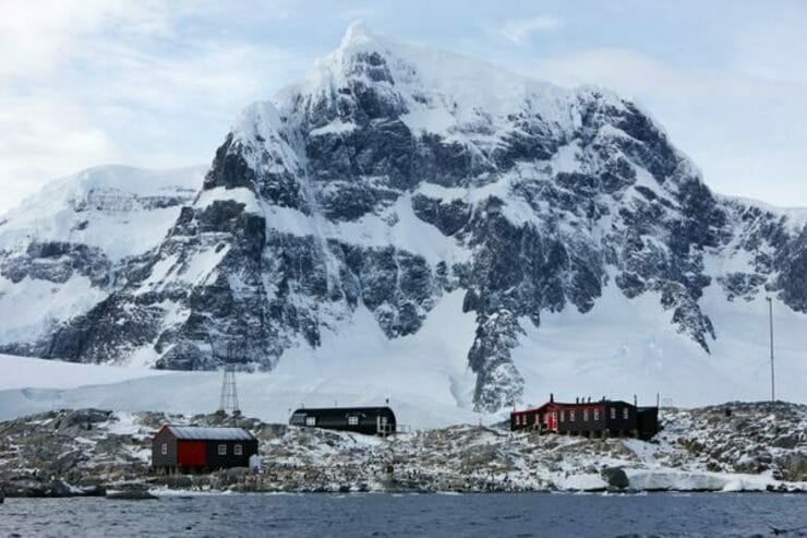 Goudier Island is a windswept speck of dark rock located off the northwest coast of the Antarctic Peninsula. Two prefabricated wooden buildings and a metal Nissen hut, all painted black with red trim, stand near the waters of Port Lockroy.