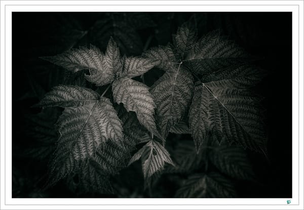 When I came to look at the file, and begin to approach it, what came to me was a memory of making platinum prints and using toners to shift the print colours. Most darkroom printing is done on emulsions made from either silver chloride or silver bromide (or both). However, alongside that were prints made using platinum, which yields along the tonal scale in a rather beautiful warmth. I have an app which gives me a platinum "look". And I headed in that direction. Somehow, by choosing that path, I felt I was honouring the early pioneers of the medium, in particular the late Ansel Adams, who had given me the inspiration to bend over and photograph a humble salmonberry growing at the roadside. Then I applied an electronic gold toner (I once used that for real) to shift the highlights call and the shadows warm.