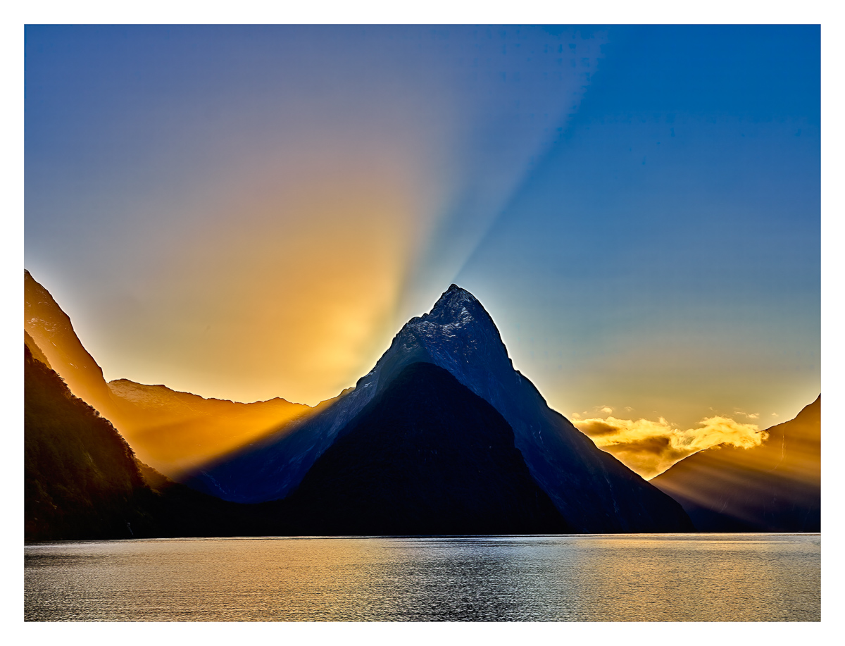 One afternoon, around lunchtime, I was travelling back south toward Te Anau, and I noticed how the sun was pushing around the corner of the Sawtoothed Range, bouncing off the mountains and reflecting on the water.