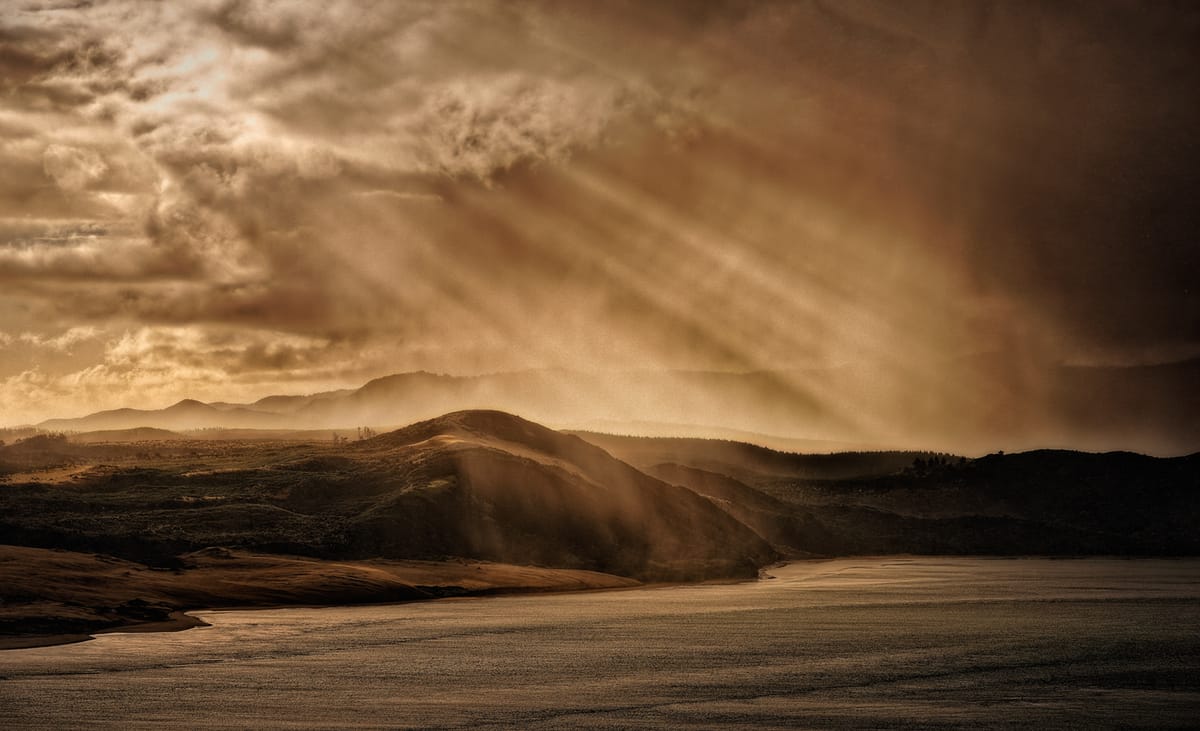 I almost drove through the intersection and over the bank in haste to get there but corrected myself at the last second.When I reached the edge of the lake, the drama continued, and the final act was yet to happen.Four years ago, almost to the day, Koromatua, known around here as the Sentinel, a strange little hill that looks somewhat like a sphinx covered in bush, a place which has talked to me on many levels and at different times, showed me that, while he has big brothers rising massively up behind him, he is the one running the show. I made a picture (I've included it below), and despite visiting the place many times, it has never repeated itself.Not once.I got out of the car with my camera, hoping I was about to see something equally profound and spectacular. But, unfortunately, I wasn't holding my breath because the small hill was shadowed and tucked away.Then Te Raa, the Sun, reached a fiery hand down into the dough clouds, prised a hole in them, and breathed down a soft liquid shaft of light which gently wrapped itself around Koromatua.