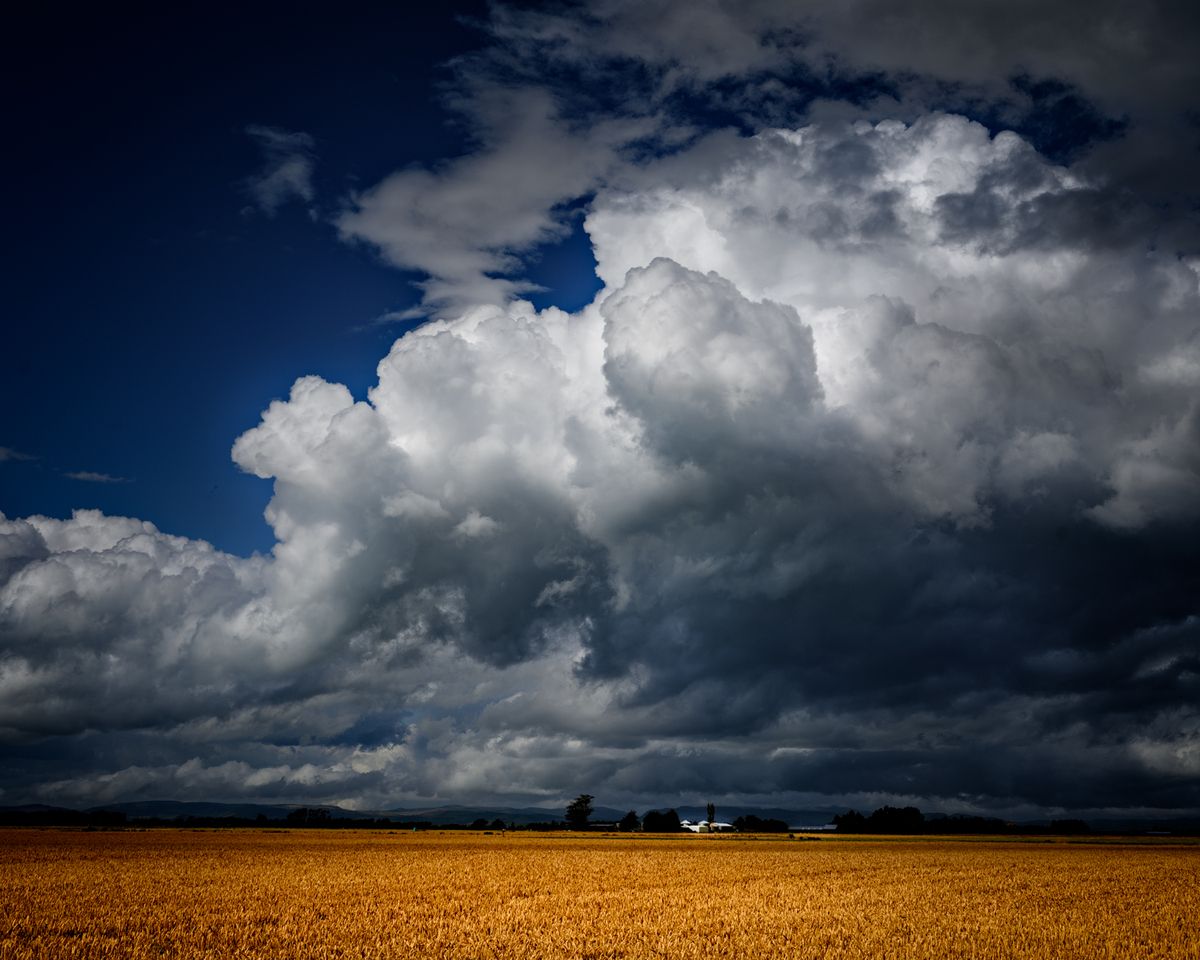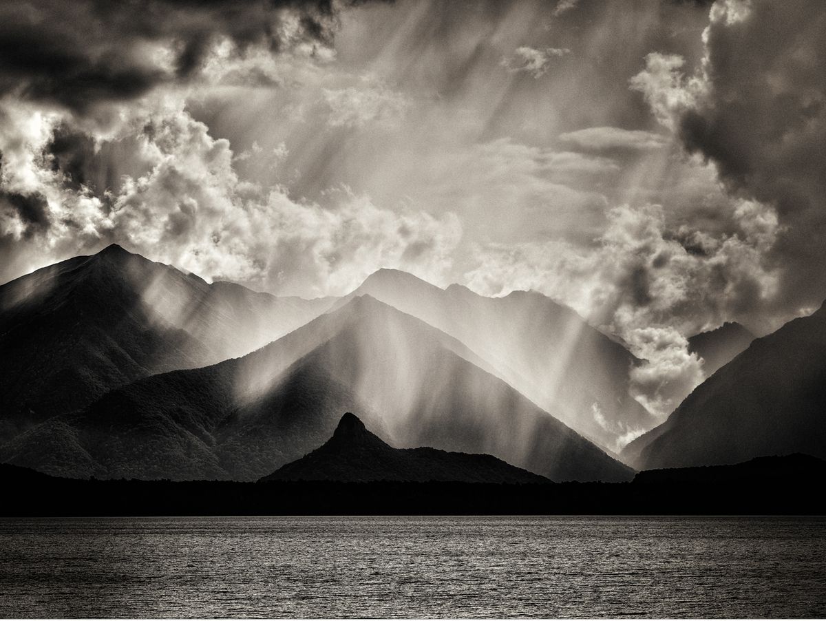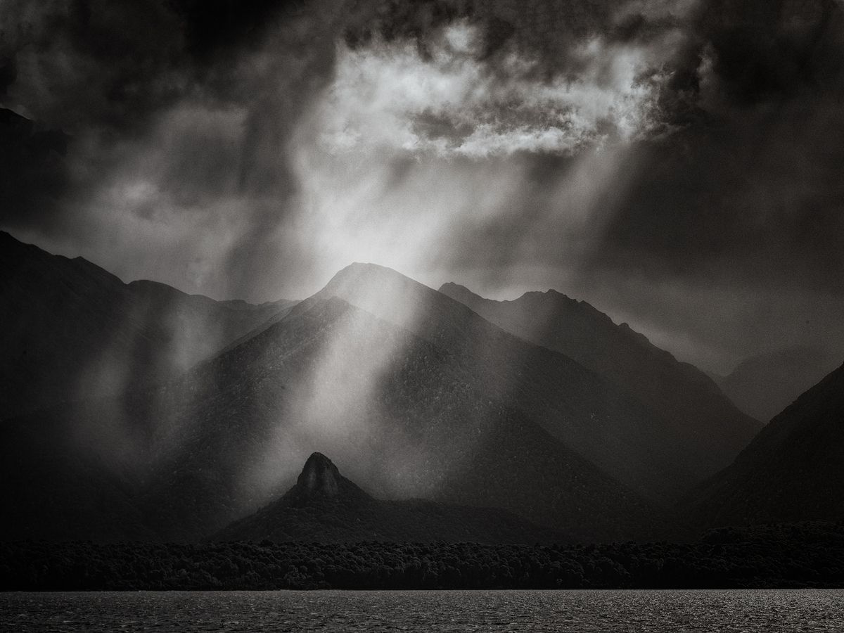 A few weeks ago, I noticed that rather than looking down, I was looking up, watching the wind and the cloud rollers wandering across the sky.I had to go into town (a two-hour drive) to get a towbar fitted on my car (that's a tow hitch for those of you readers in North America). So I left around 6 am for my appointment at 8 o'clock. As I drove in, I could see that the weather was on the turn., Days and weeks of settled weather and hot summer temperatures in the early 30s were about to give way for a few days to some lovely cold fronts coming up from the south. It really was a red sky in the morning. I put my foot down and ignored the warning.I was in town all day and finally left for home around 4 pm. It was rather lovely to navigate my way through and around grumbling storm cells dragging their rain skirts across the Southland plains. If nothing else, the weather was dramatic, and the cloudscapes made a change from the tedious, flattened blue overarch of the weeks before. You can have too much of a good thing.Then, as I drove down the long straight to the Key, which points directly at Lake Manapouri and the Cathedral mountains, I saw that the storm front from the southwest was pushing its way north past Dusky and Doubtful Sounds. The wind was doing its best to reach across the lake but failing miserably. The late afternoon sun was punching holes in the cloud and sending light down through them, drifting shafts that pick their way across the face of the shadowy and shadowed mountains.I hadn't intended to take the camera, but as I was walking out the door, the Inner Voice, which has guided me down the decades, told me, in no uncertain terms, to put it in the car. For once, at least, I obeyed.I couldn't take my eyes off what was happening in the distance; it was mesmerising and somehow calling to me, inviting me to bring my camera to a party for two.For the first time in a long time I was feeling a familiar rising tension in my puku (stomach), that feeling which comes when the land is calling to you.I had a choice: I was only twenty minutes from home, from a cold drink and rest after twelve hours on the road, or adding on another forty minutes and taking a long detour in the hope of making another likeness of the land. I could choose to carry straight on, or turn left onto Hillside Road, drive another fifteen minutes, and hope it was still there when I arrived.I turned left.